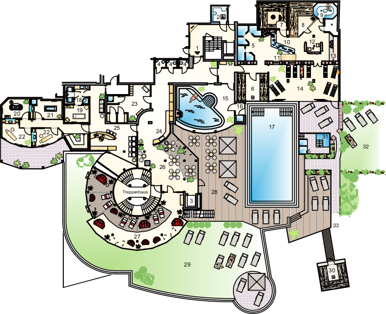 1 Eingang in den Wellnessbereich - 2 Rollstuhlgerechtes WC - 3 Aufzug - 4 WC - 5 Duschlandschaft - 6 Panorama-Softsauna - 7 Kräutersauna - 8 Finnische Altholz-Sauna - 9 Dampfbad - 10 Wasserlauf als Tretbecken - 11 Brücke - 12 Infrarotsitze - 13 Wärme- und Relaxbank mit Fußbecken - 14 Ruheraum (einer von vier weiteren) - 15 Innenpool - 16 Schleuße zum Außenpool - 17 Außenpool 14x6 m, ganzjährig beheizt - 18 Anwendung (Rasulbad) 19 Anwendung 20 Crystall-Duett Whirlwanne - 21 Anwendung (ThermoSpa Schwebeliege) - 22 Anwendung - 23 Umkleidekabine mit Schließfächern - 24 Wasser- und Teestation - 25 königSPA-Rezeption - 26 Wellnesslounge - 27 Ruheraum Orangerie - 28 Pooldeck - 29 Lammgarten mit Sonnenliegen - 30 Hochsitzsauna - 31 Tauchbecken - 32 Sauna-Liegewiese - 33 Verglaster Frischluftraum