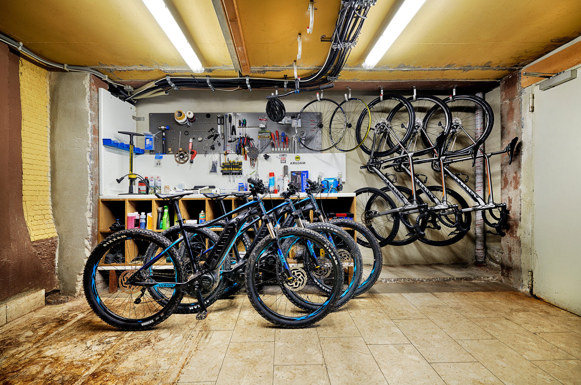 In einem Raum stehen und hängen Mountainbikes verschiedener Größen sowie Elektrobikes.