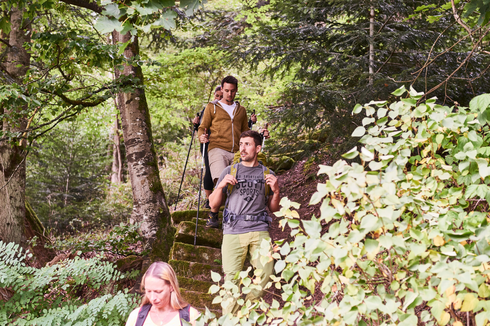 Gäste sind mit Wanderrucksäcken und Wanderstöcken auf einem Wanderweg durch den Schwarzwald.