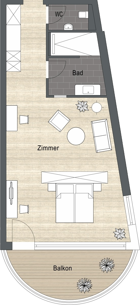 • Juniorsuite mit Süd-West-Hangseite im Haupthaus mit halbrundem Romantikbalkon oder Terrasse