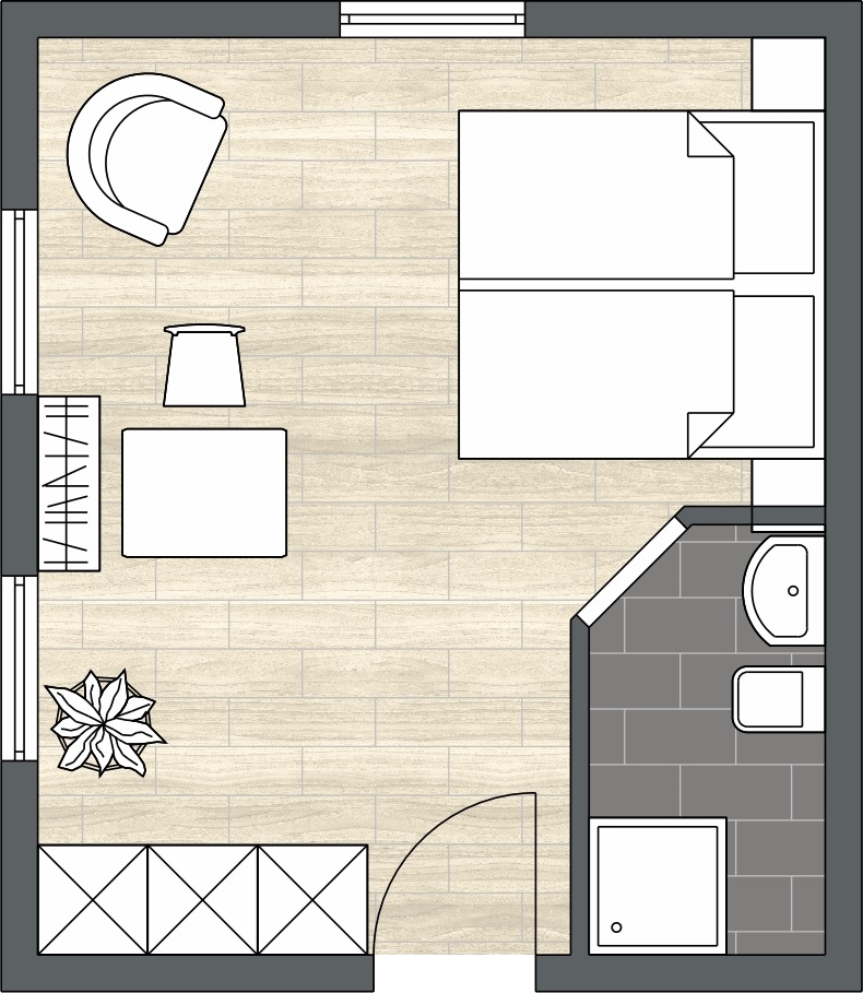 • Sehr individuelle Grundrisse, die Zimmer in den oberen Stockwerken haben teilweise Dachschrägen.